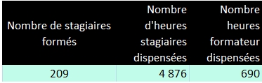 Nombre de stagiaires formés + nombre d'heures stagiaires et formateur dispensées